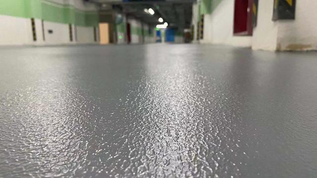 第二步:待第一遍面漆完全干燥后,用齒刀按 0.4 的用量進(jìn)行施工。穿釘鞋,用拉毛滾筒的方式進(jìn)行全面整體的施工(環(huán)氧面漆混合好的材料要在 30 分鐘左右使用完)。